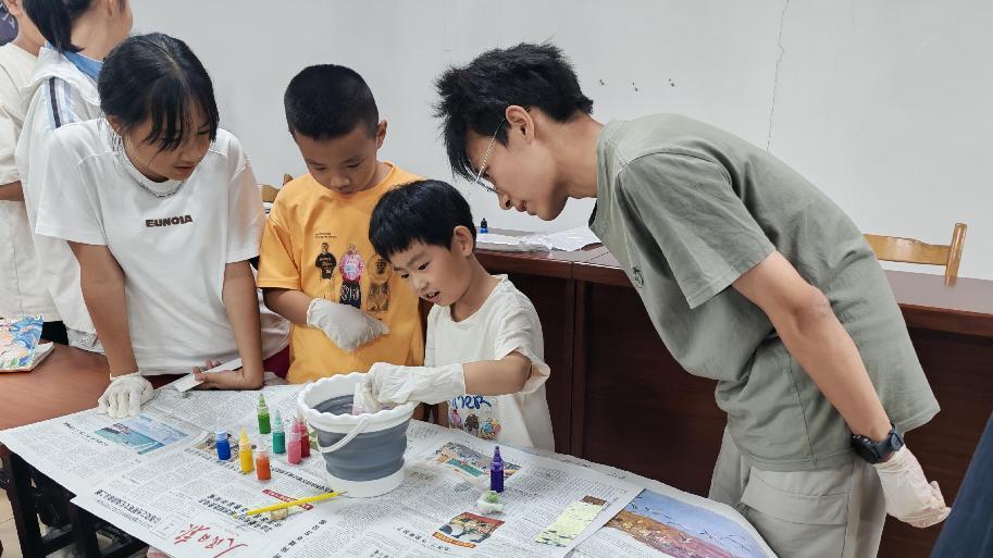 在天河社区的活动室里,实践团成员们组织了一场面向儿童的趣味绘画活动。团队成员耐心地教孩子们画荷花。孩子们兴致勃勃,用稚嫩的笔触描绘着心中的夏日荷花,现场充满了专注与欢乐的气氛。