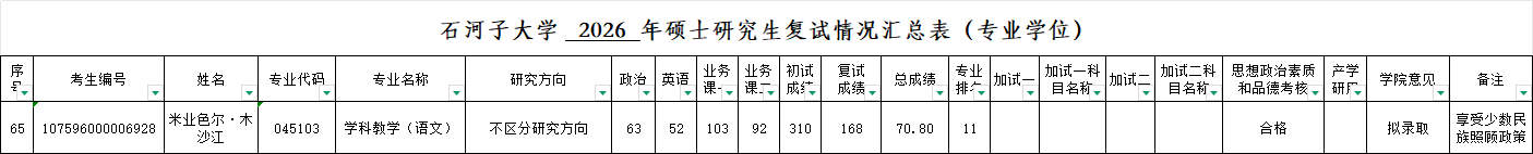 石河子大学文学艺术学院2026年研究生复试结果公示(一志愿递补录取)