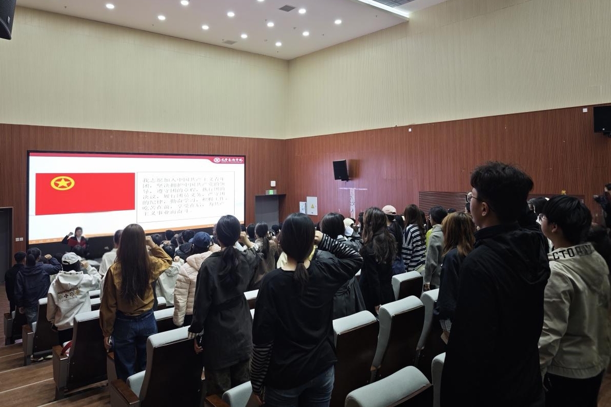 活动现场,全体团员面向团旗庄严宣誓,重温入团誓词,铿锵有力的誓言回荡在报告厅内,凝聚着青年一代传承红色血脉、勇担时代使命的坚定信念。随后,三位同学依次讲述了周恩来总理、王震将军、张仲瀚同志及孟二冬教授的感人事迹,生动再现了英烈们为国家独立、民族复兴、教育事业奉献一生的崇高风范,带领在场团员深刻感悟英烈精神的时代内涵。活动期间,还通过诗歌朗诵、默哀致敬、观影学习等多种形式,深切表达对英烈的崇高敬意与无尽哀思,现场气氛庄重肃穆,每一位团员都接受了一次深刻的精神洗礼。